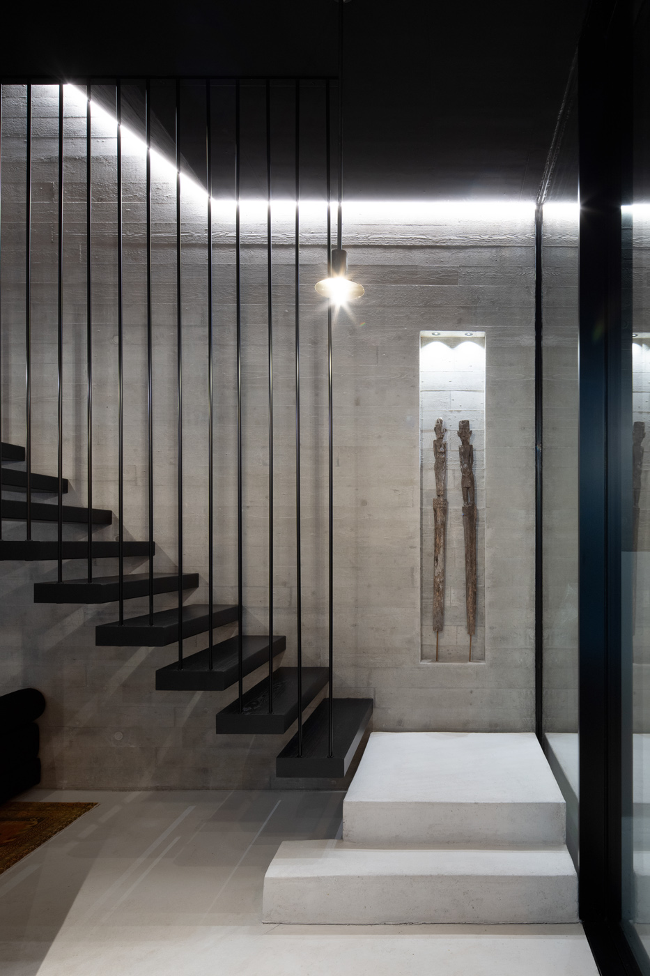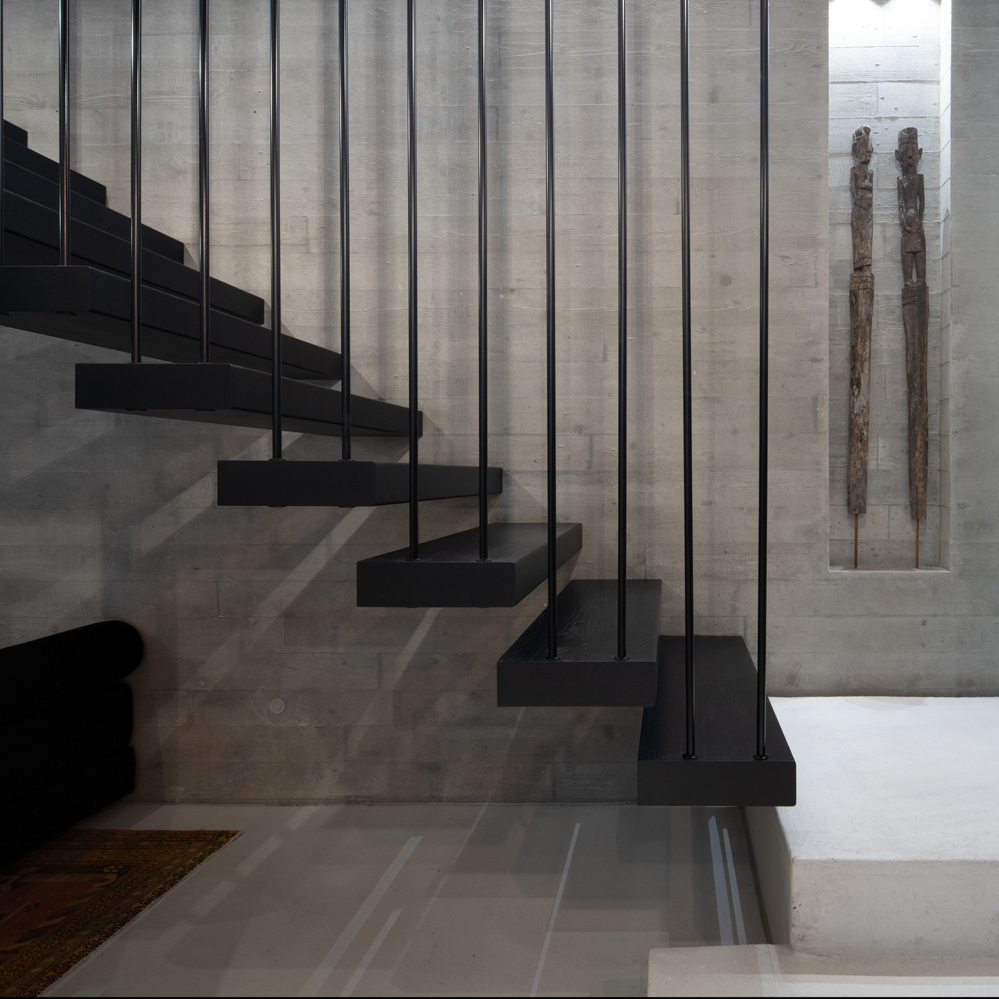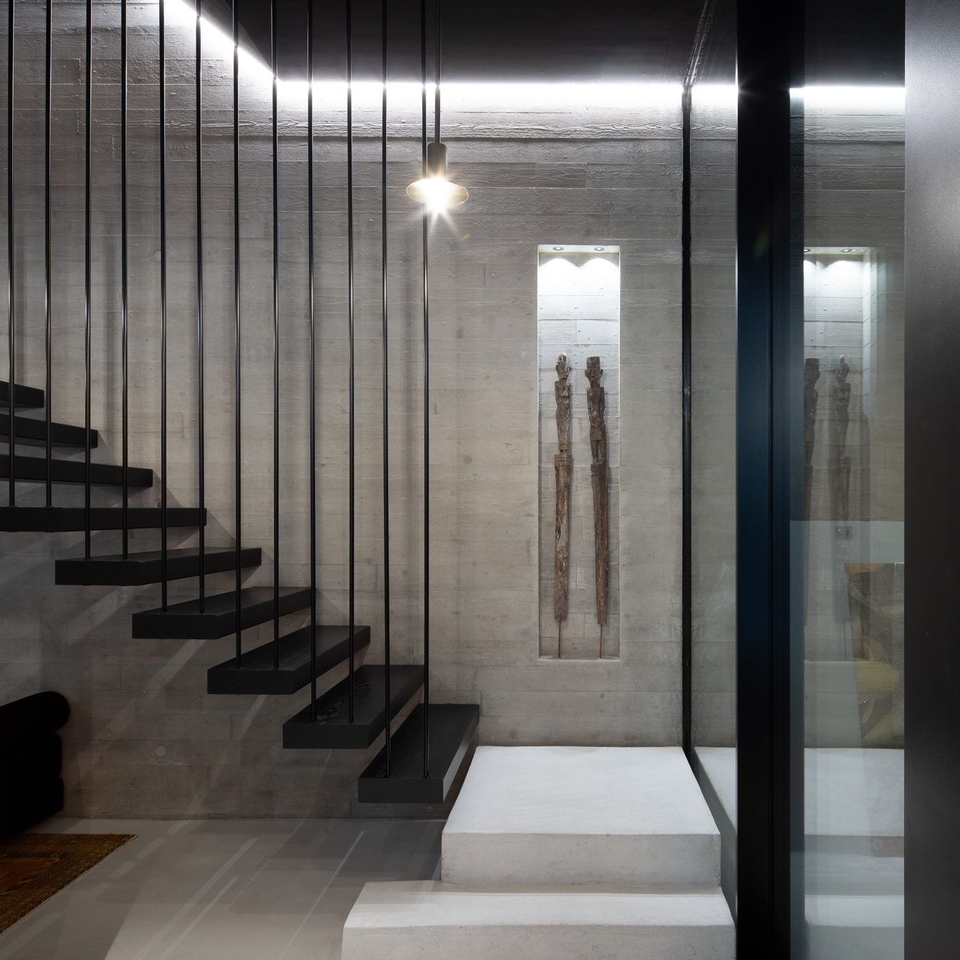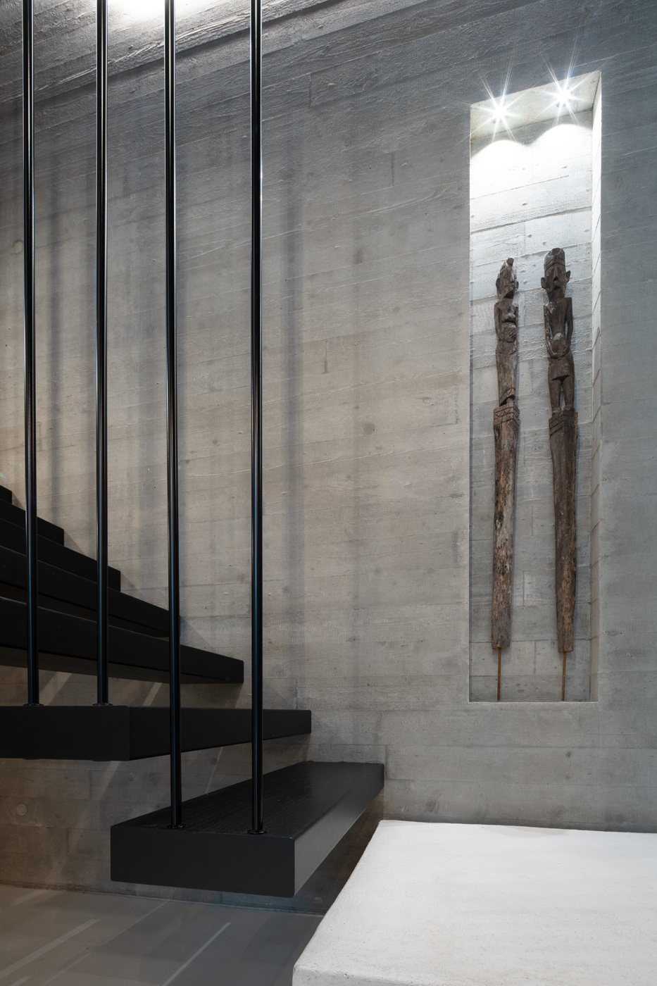 Schwebende Stufen, roher Beton und feine Linien treffen auf Licht und Ruhe.
