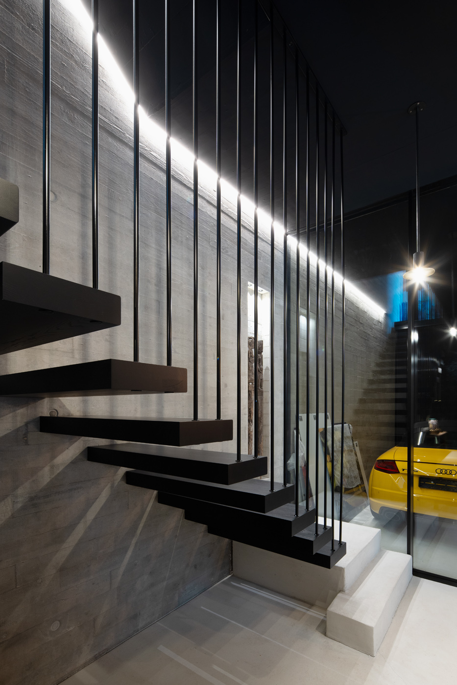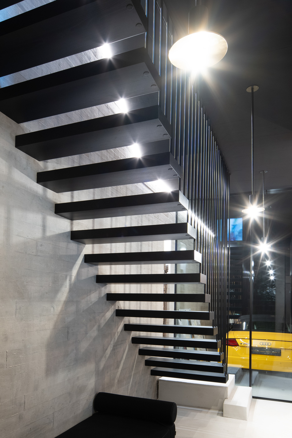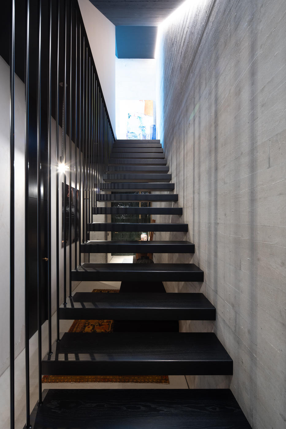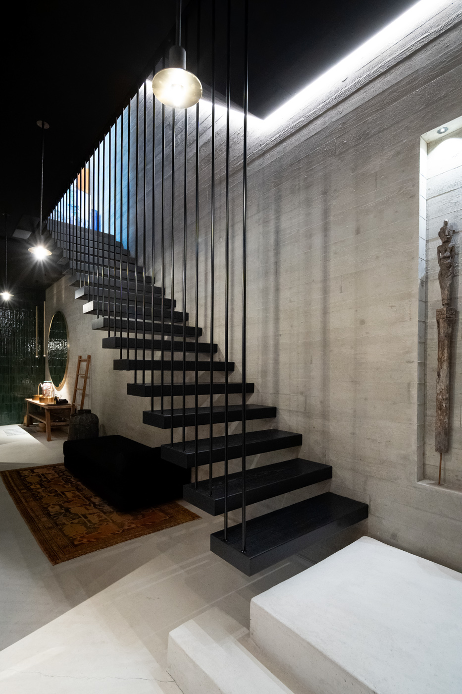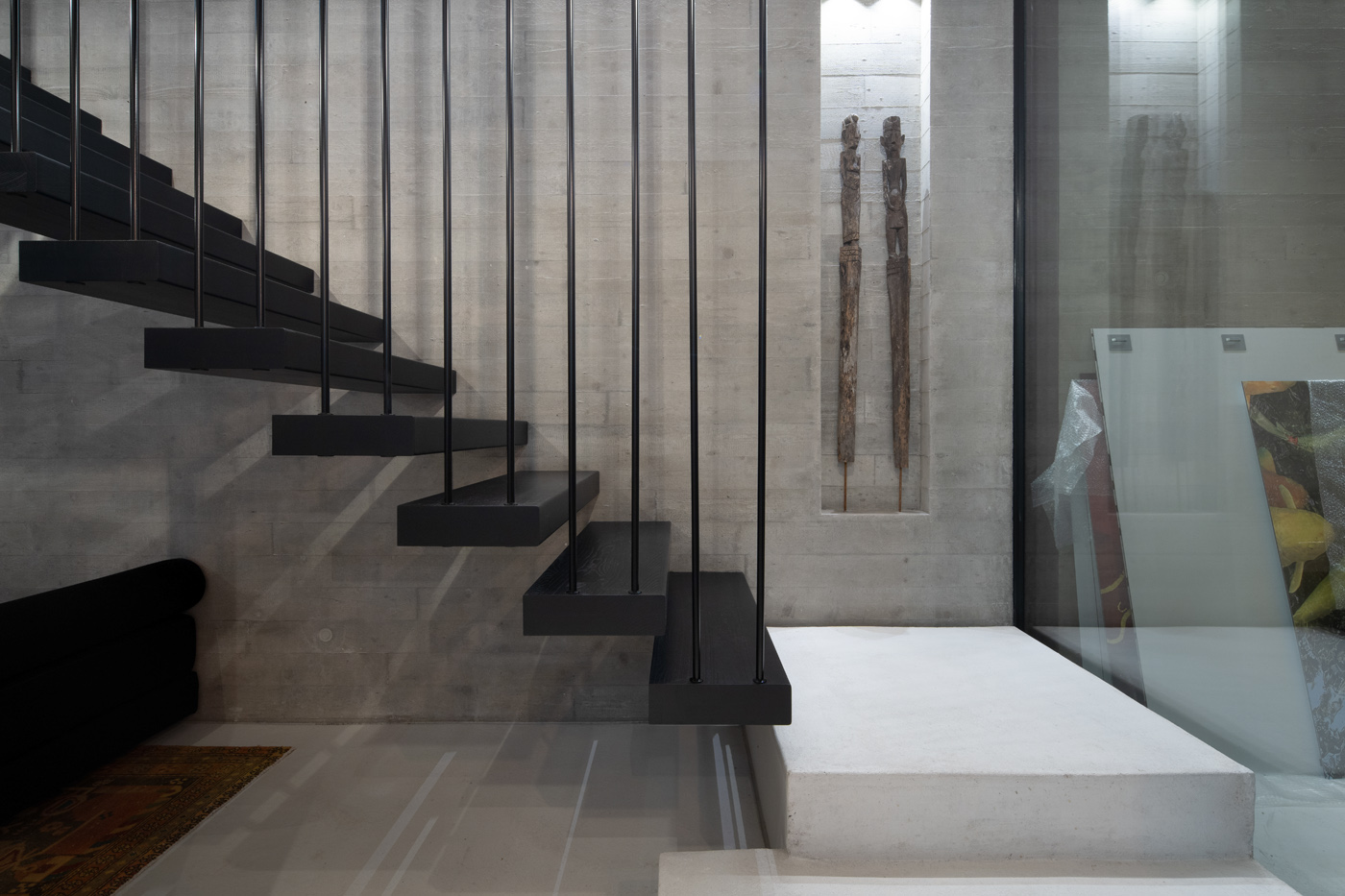 Schwebende Stufen, roher Beton und feine Linien treffen auf Licht und Ruhe.