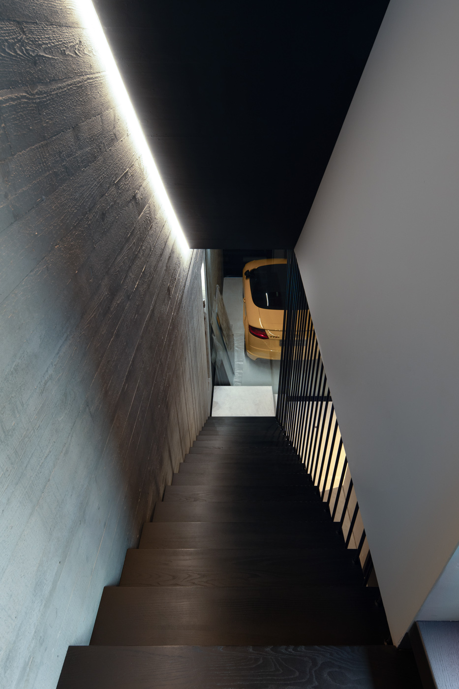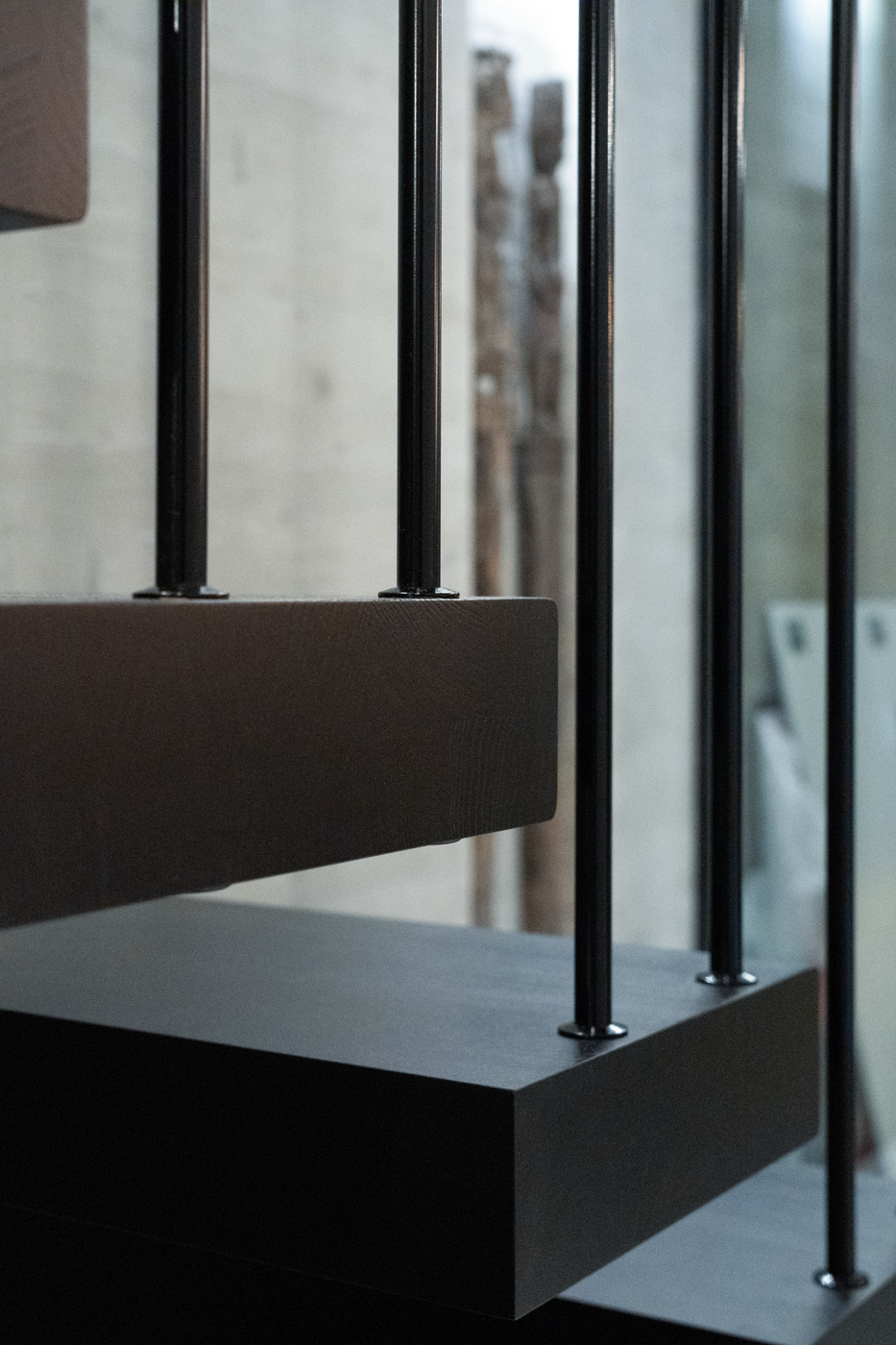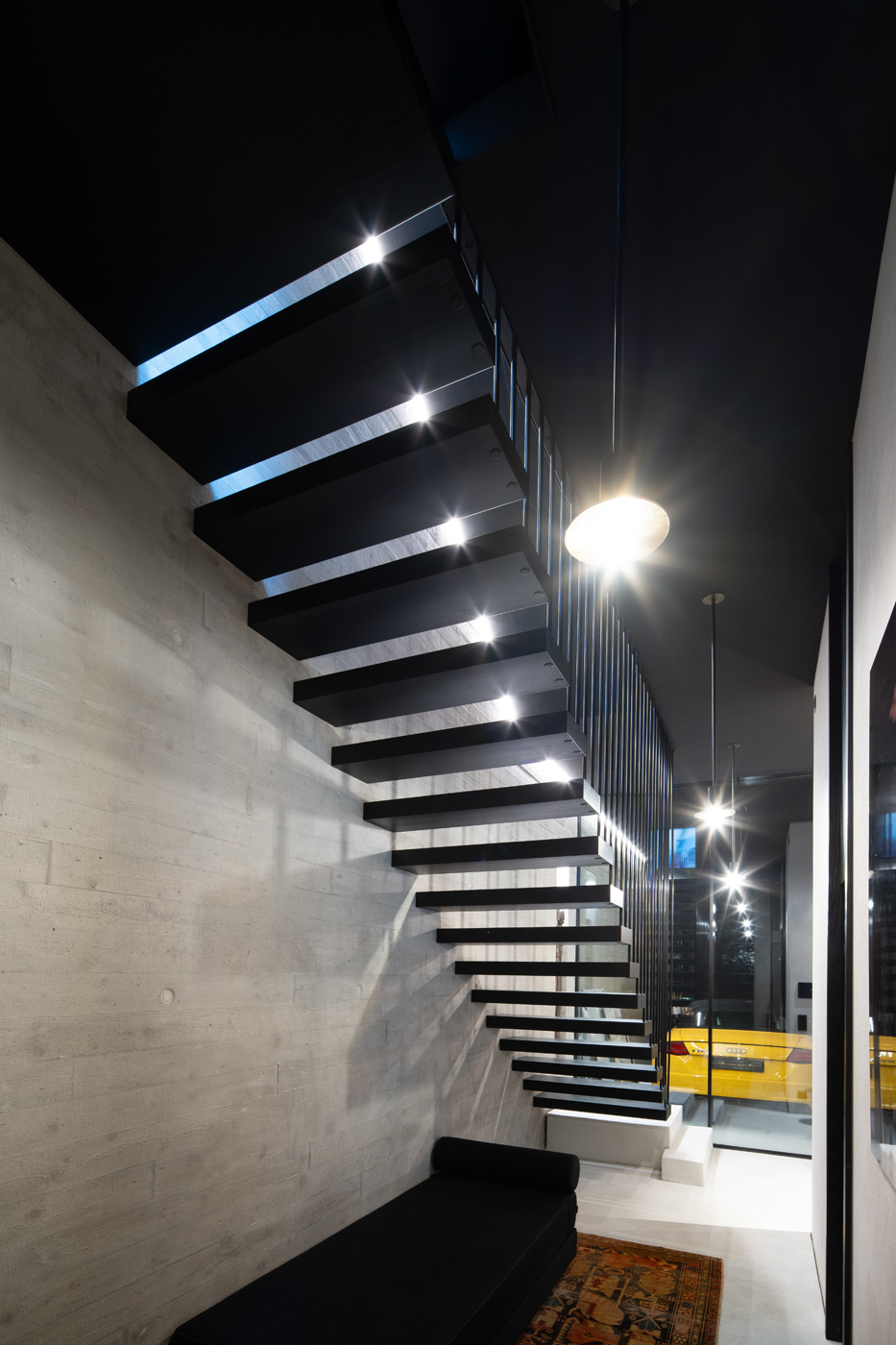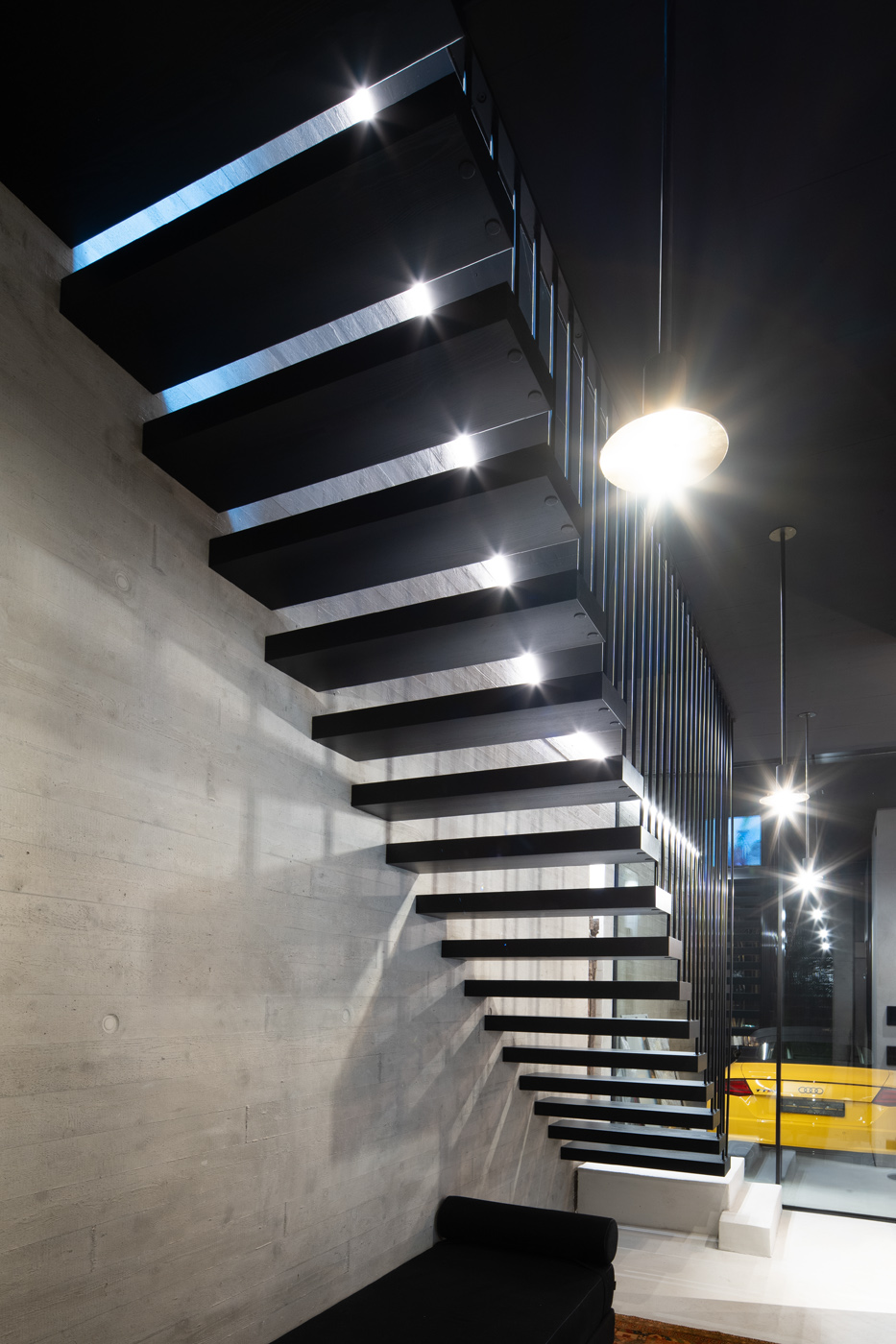 Schwebende Stufen, roher Beton und feine Linien treffen auf Licht und Ruhe.