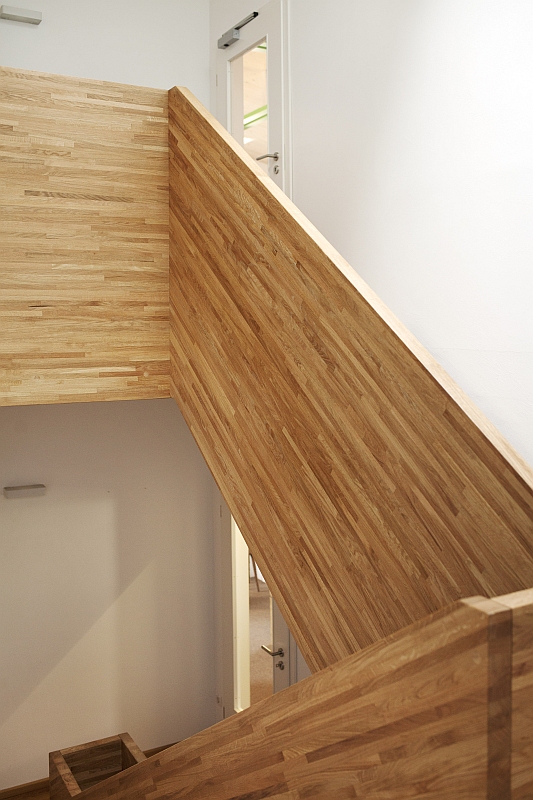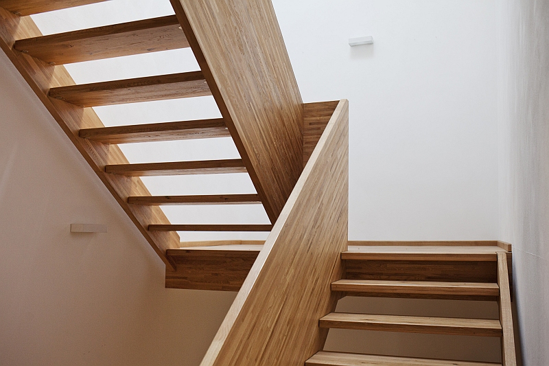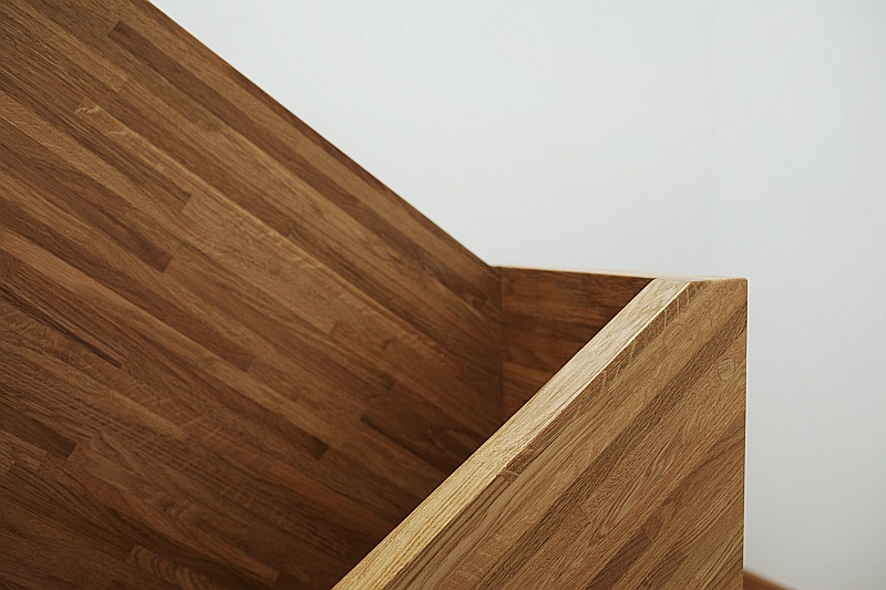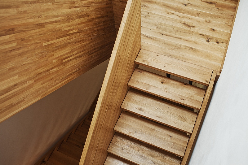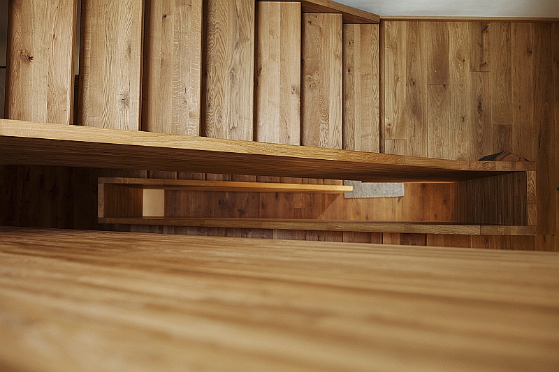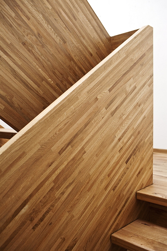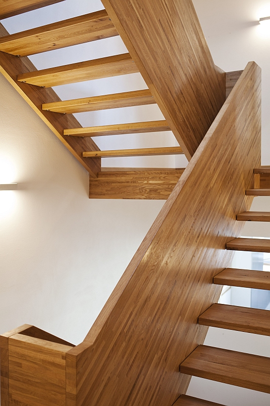 Gefertigt wurde die Treppe komplett aus massiver Eiche. Die Breitwangen in Leimholzoptik in schmalen Lamellen und die Treppenstufen in schönster Wildeiche in Premium-Blockverleimung. Die Oberfläche wurde passend zum Dielenboden komplett geölt.